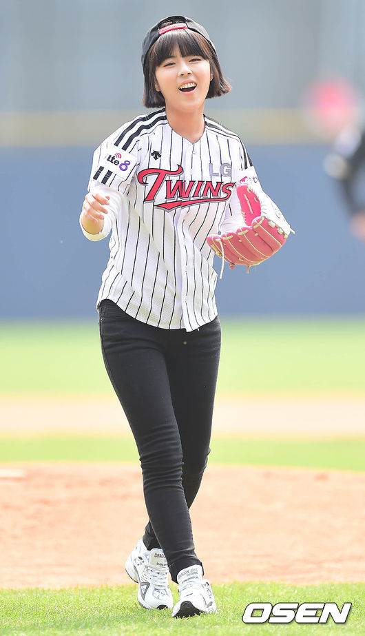 시구자로 나선 도희가 공을 던진 뒤 아쉬움이 미소를 짓고 있다.
