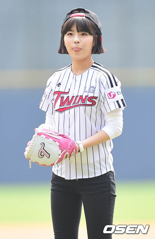 시구자로 나선 도희가 공을 던질 준비를 하고 있다.