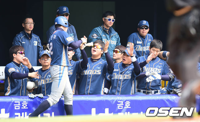 1회초 NC 공격 무사 2, 3루 상황 나성범의 내야 땅볼 때 홈을 밟은 박민우가 더그아웃 동료들과 인사를 나누고 있다.