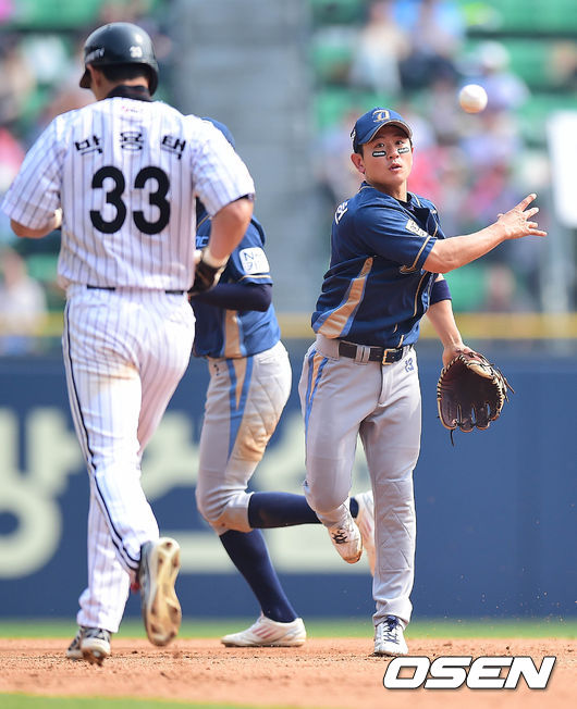 3회말 LG 공격 무사 1, 3루 상황 이진영의 내야 땅볼 때 NC 유격수 손시헌이 주자 박용택을 포스아웃 시킨 뒤 1루로 송구하고 있다.