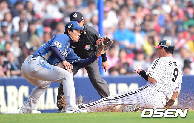 4회말 LG 공격 1사 1루 상황 오지환의 우전안타 때 1루주자 이병규가 3루까지 내달려 세이프되고 있다.