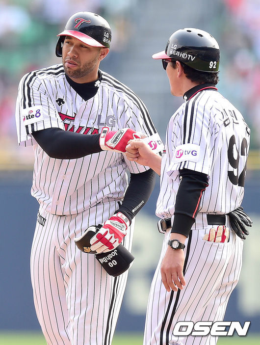 5회말 LG 공격 1사 1, 3루 상황 조쉬벨이 역전 1타점 적시 좌전안타를 날리고 1루에 안착해 김민호 코치와 인사를 나누고 있다.