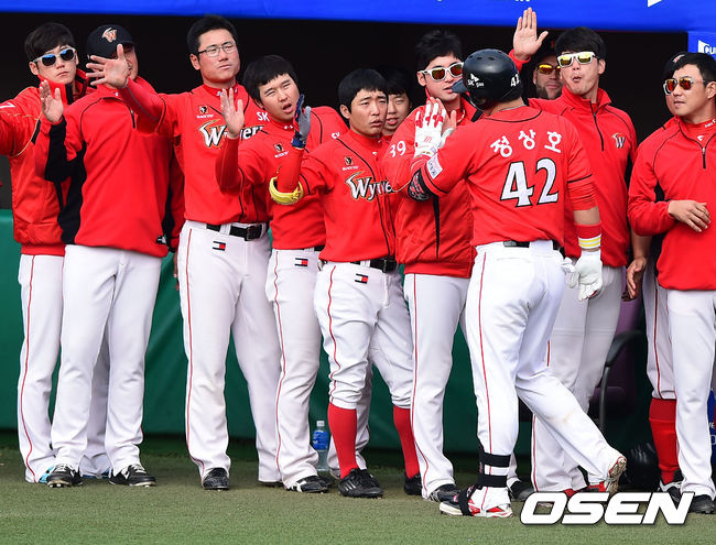 12일 오후 대구구장에서 열린 '2014 한국야쿠르트 세븐 프로야구' 삼성 라이온스와 SK 와이번스의 경기,6회초 2사 SK 장성호가 솔로홈런을 날리고 동료들의 축하를 받고 있다