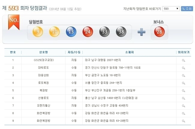 12일 제593회 나눔로또 추첨 결과 1등 당첨번호는 '9, 10, 13, 24, 33, 38'이며, 2등 보너스 번호는 '28'이다.