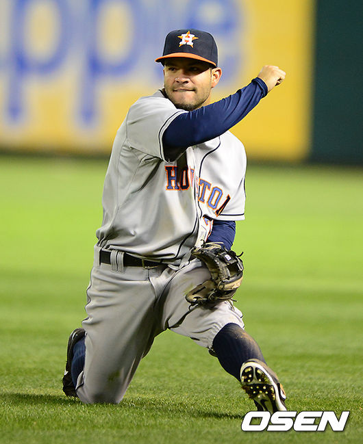 8회말 1사에서 휴스턴 호세 알튜브가 텍사스 필더의 2루 땅볼 타구를 잡아 1루로 송구, 아웃시키고 있다. /jpnews@osen.co.kr
