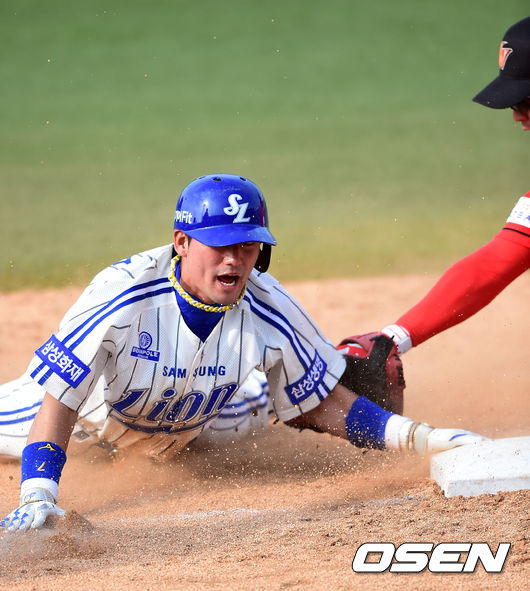12일 오후 대구구장에서 열린 '2014 한국야쿠르트 세븐 프로야구' 삼성 라이온스와 SK 와이번스의 경기,7회말 무사 2루 삼성 정형식의 타석때 2루 주자 김상수가 3루 도루 성공하고 있다.