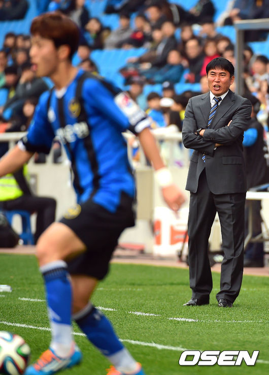 13일 오후 인천축구전용경기장에서 열린 '현대오일뱅크 K리그 클래식 2014' 인천 유나이티드와 수원 블루윙즈의 경기 전반 인천 김봉길 감독이 경기를 관전하고 있다.