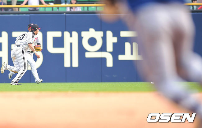 8회초 NC 공격 2사 1루 상황 손시헌의 중전 안타를 뒤로 빠트린 LG 중견수 박용택이 공을 잡기 위해 뛰고 있다. 중견수 실책으로 기록되며 타자주자는 2루까지.