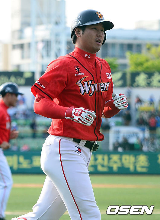 12일 오후 대구구장에서 열린 '2014 한국야쿠르트 세븐 프로야구' 삼성 라이온스와 SK 와이번스의 경기,8회초 무사 만루 SK 최정이 만루 홈런을 날리고 베에스를 밟고 있다,