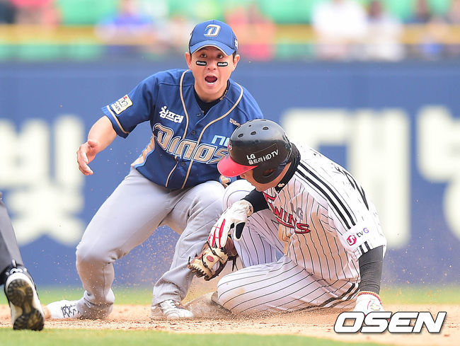 8회말 LG 공격 2사 1루 상황 정의윤의 2루 도루 성공 때 NC 유격수 손시헌이 아쉬워하고 있다.