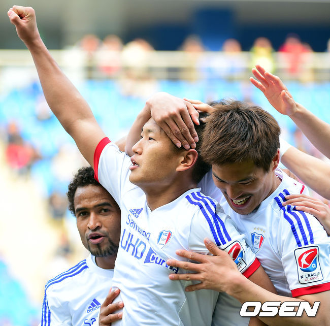 13일 오후 인천축구전용경기장에서 열린 '현대오일뱅크 K리그 클래식 2014' 인천 유나이티드와 수원 블루윙즈의 경기 후반 수원 정대세가 패널티킥으로 추가골을 넣은 뒤 동료들과 기뻐하고 있다.