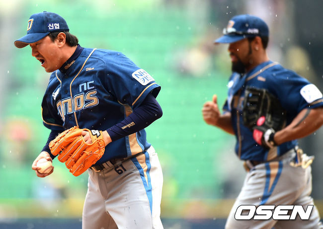 9회말 LG 공격 2사 2, 3루 상황 조쉬벨을 내야 땅볼로 이끌며 실점없이 이닝을 마무리지은 NC 투수 손민한이 환호하고 있다.