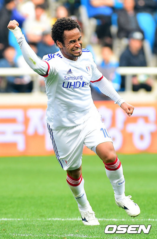 13일 오후 인천축구전용경기장에서 열린 '현대오일뱅크 K리그 클래식 2014' 인천 유나이티드와 수원 블루윙즈의 경기 후반 수원 산토스가 추가골을 넣은 뒤 기뻐하고 있다.