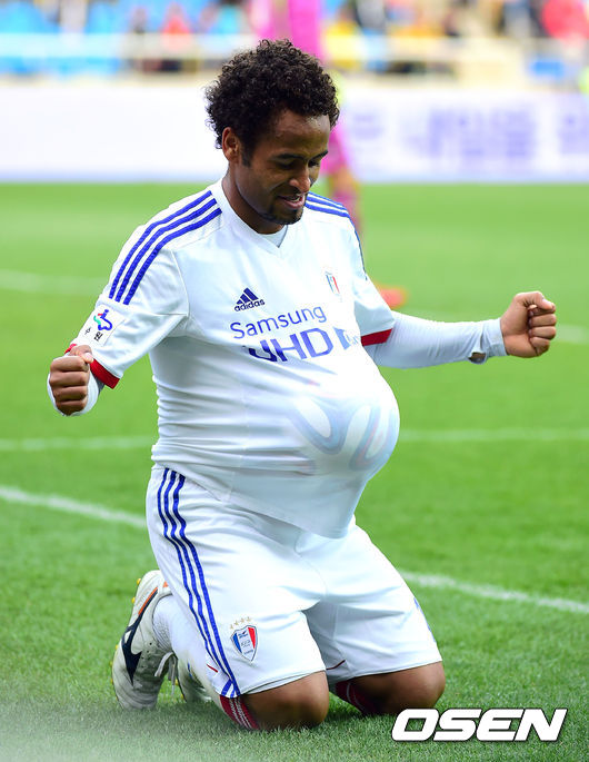 13일 오후 인천축구전용경기장에서 열린 '현대오일뱅크 K리그 클래식 2014' 인천 유나이티드와 수원 블루윙즈의 경기 후반 수원 산토스가 추가골을 넣은 뒤 기뻐하고 있다.
