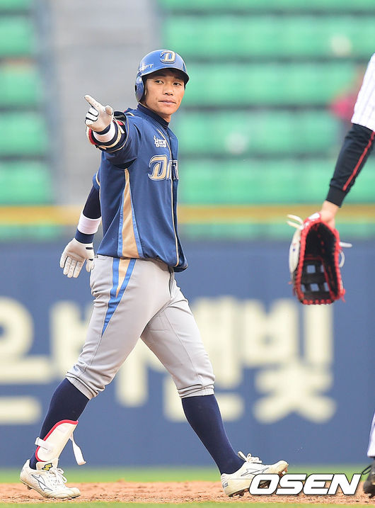 12회초 NC 공격 선두타자로 나선 NC 이종욱이 우익선상 2루타를 날리고 2루에 안착해 환호하고 있다.