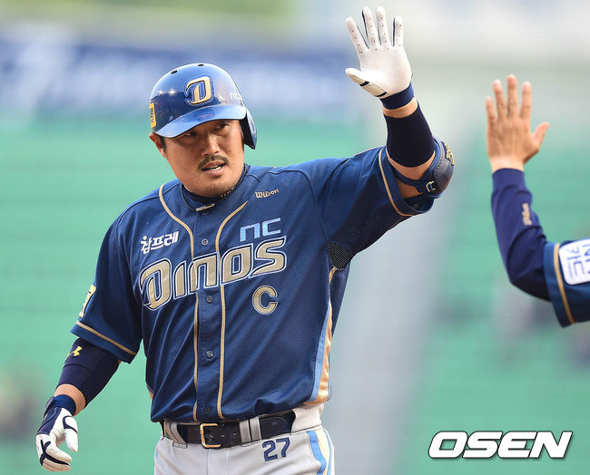 12회초 NC 공격 1사 3루 상황 이호준이 1타점 중전 적시타를 날리고 1루에 안착해 전준호 코치와 인사를 나누고 있다.