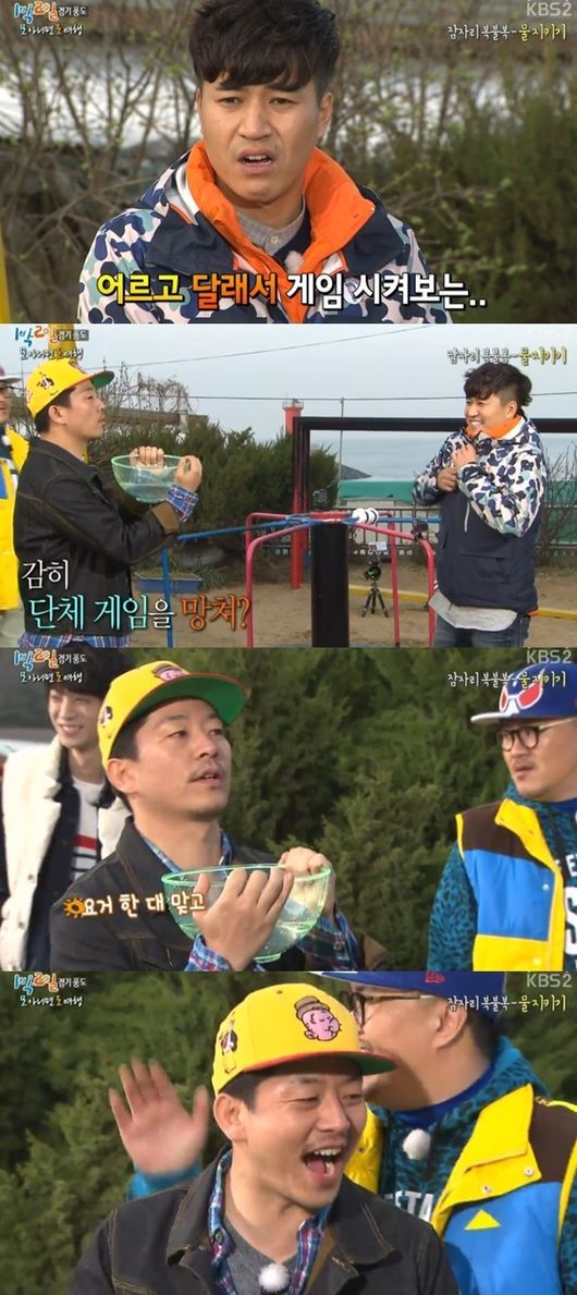 놀이터의 뱅뱅이에 탄 멤버들은 10바퀴를 돈 후에 상자에 물을 부어야 했는데, 김종민은 뱅뱅이를 돌리는 김준호와 데프콘에 고의적으로 물을 끼얹어 싸움이 났다. 김종민이 단체전인 게임을 망쳤다는 것이 분노의 요인이었다.