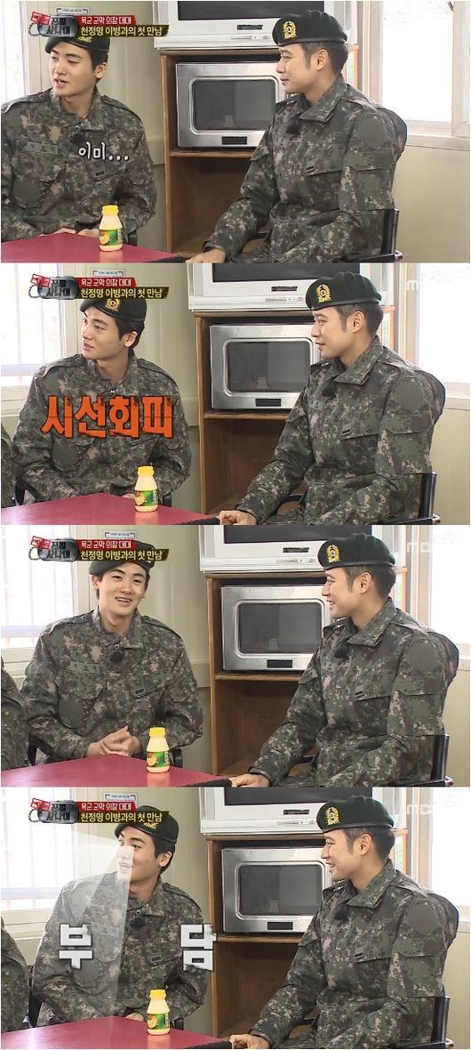 다른 멤버들은 “왜 눈을 못 보냐”고 놀려댔지만 박형식은 “시간이 지나면 보게 돼 있다”고 공포감을 드러냈다. 천정명은 박형식의 후임이었지만 현역 복무 당시 악마조교로 불릴만큼 완벽한 군생활의 표본을 보여주며 신병 같지 않은 신병으로 불리고 있다.
