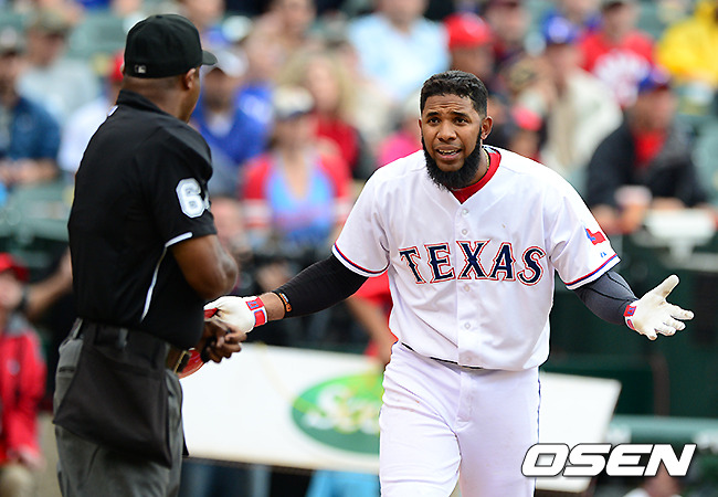3회말 2사에서 텍사스 앤드루스가 삼진에 배트를 던지자 구심이 퇴장 명령을 내렸다. 이에 앤드루스가 구심에 불만을 나타내고 있다. 앤드루스는 올 시즌 텍사스의 첫 퇴장을 당했다./jpnews@osen.co.kr