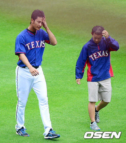 경기에 앞서 텍사스 다르빗슈가 불펜피칭을 마치고 비를 맞으며 러닝을 하고 있다. /jpnews@osen.co.kr