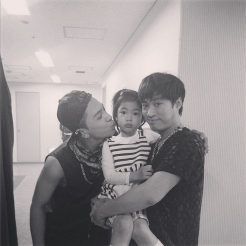 공개된 사진 속 태양은 이하루 볼에 뽀뽀를 하고 있는 모습이다. 하루는 아빠 품에 안겨 눈을 동그랗게 뜨고 있다. 타블로와 태양의 훈훈한 선후배 관계 역시 돋보인다.