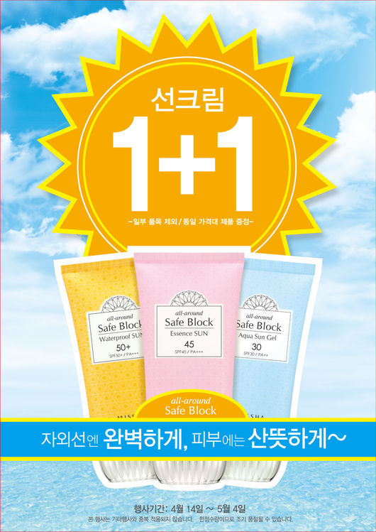 다음달 4일까지 진행되는 ‘자외선 차단제 1+1 이벤트’를 통해 자외선 차단제 한 품목 구매 시 동일 가격의 차단제를 하나 더 받을 수 있다. 신제품, 남성용 자외선 차단제를 포함해 11품목이 대상으로 전국 미샤 매장과 뷰티넷(www.beautynet.co.kr)에서 진행 된다.