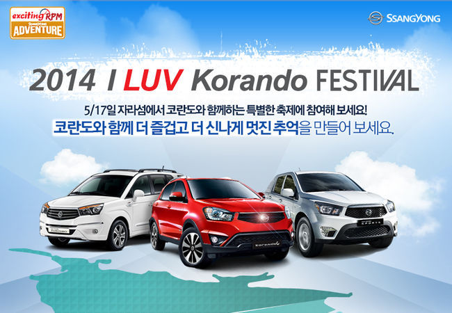 쌍용차는 'LUV(Leisure Utility Vehicle) 코란도' 통합BI(Brand Identity)와 캠페인 론칭을 기념해 5월 17 경기 가평 자라섬에서 참가자 1000팀(2000명)을 초청해 '아이 러브 코란도 페스티벌(2014 I LUV Korando Festival)'을 개최하며 '코란도'의 운전자들이 마음껏 개성을 표현할 수 있는 콘테스트를 비롯해 여러 행사가 펼쳐질 예정이다.