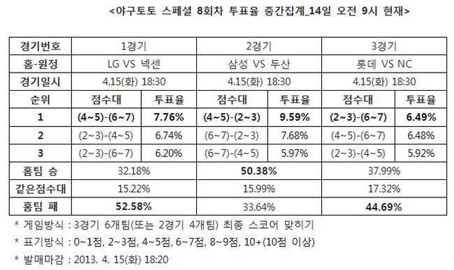 KBO 3경기 대상 야구토토 스페셜 8회차 투표율 중간집계
