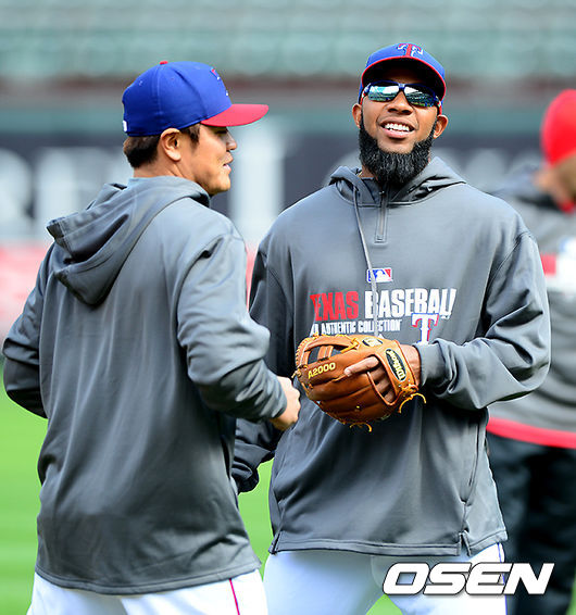 경기에 앞서 텍사스 추신수가 앤드루스와 몸을 풀며 이야기 나누고 있다. 앤드루스는 지난 1일 경기서 삼진을 당한 뒤 배트를 던져 퇴장 당했다.