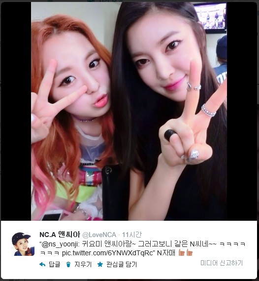지난 14일 NS윤지의 트위터를 통해 공개된 사진에는 NS윤지와 NC.A가 마치 친자매를 연상케 하듯 다정한 포즈를 취하고 있는 모습이 담겨져 있다.
