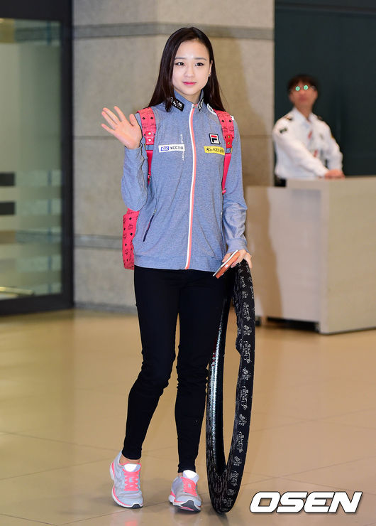 손연재가 입국장을 나가며 취재진을 향해 손을 흔들고 있다.