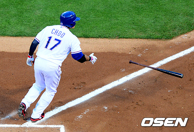 1회말 무사에서 텍사스 추신수가 볼넷으로 출루하고 있다.