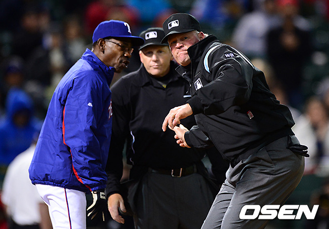 6회초 1사 만루에서 텍사스 워싱턴 감독이 시애틀 밀러의 내야땅볼에 3루주자 애클리가 홈에서 비디오 판독 결과 판정이 번복되며 세이프되자 이에 항의, 퇴장을 당하고 있다.