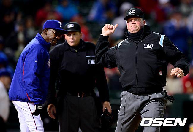 6회초 1사 만루에서 텍사스 워싱턴 감독이 시애틀 밀러의 내야땅볼에 3루주자 애클리가 홈에서 비디오 판독 결과 판정이 번복되며 세이프되자 이에 항의, 퇴장을 당하고 있다.