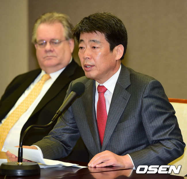 15일 오후 서울 프레스센터에서 열린 이용대-김기정 선수 긴급 기자회견에서 신계륜 대한 배드민턴 회장이 발표를 하고 있다.