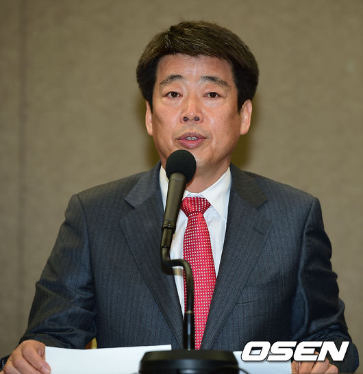 15일 오후 서울 프레스센터에서 열린 이용대-김기정 선수 긴급 기자회견에서 신계륜 대한 배드민턴 회장이 발표를 하고 있다.