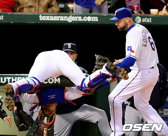 6회초 1사 1,2루에서 텍사스 아렌시비아가 시애틀 애클리의 파울 타구를 잡으려다 펜스에 걸려 넘어지고 있다.