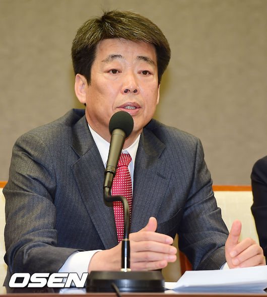 15일 오후 서울 프레스센터에서 열린 이용대-김기정 선수 긴급 기자회견에서 신계륜 대한 배드민턴 회장이 발표를 하고 있다.
