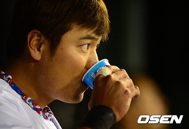 6회말 1사에서 텍사스 추신수가 2루 땅볼로 물러나고 더그아웃에서 음료를 마치고 있다.