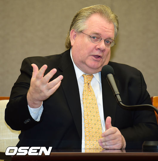 15일 오후 서울 프레스센터에서 열린 이용대-김기정 선수 긴급 기자회견에서 신계륜 대한 제프리 존스 변호사가 유창한 한국말로 질문에 답하고 있다.