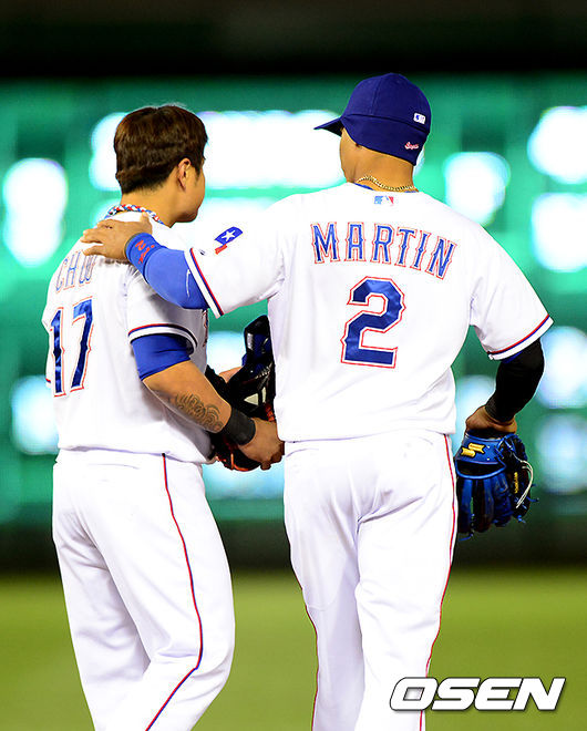 8회말 공격을 마치고 텍사스 마틴이 추신수와 외야 수비 위치로 향하고 있다. /jpnews@osen.co.kr