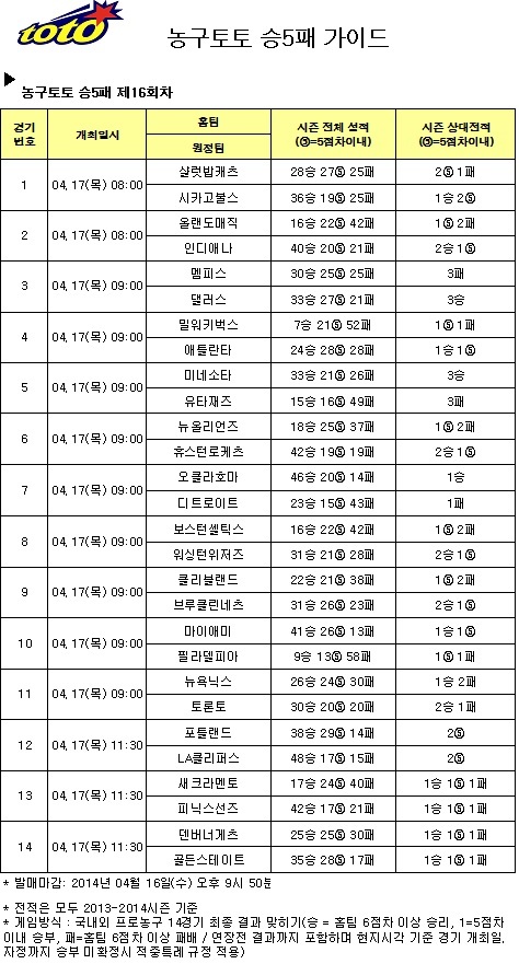 한편 이번 농구토토 승5패 16회차 게임은 미국과의 시차 관계로 16일 밤 9시50분에 발매가 마감된다.