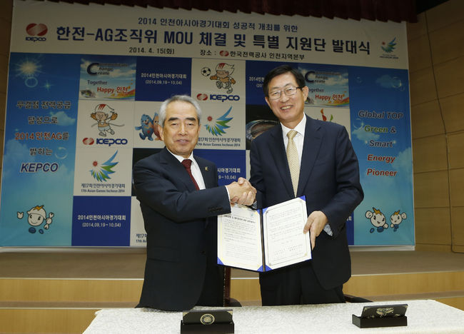 2014인천아시아경기대회 조직위원회(위원장 김영수)는 15일 한국전력인천지역본부 강당에서 한국전력공사(사장 조환익)와 ‘2014인천아시안게임의 성공적 개최를 위한 업무협약(MOU)’을 체결했다.