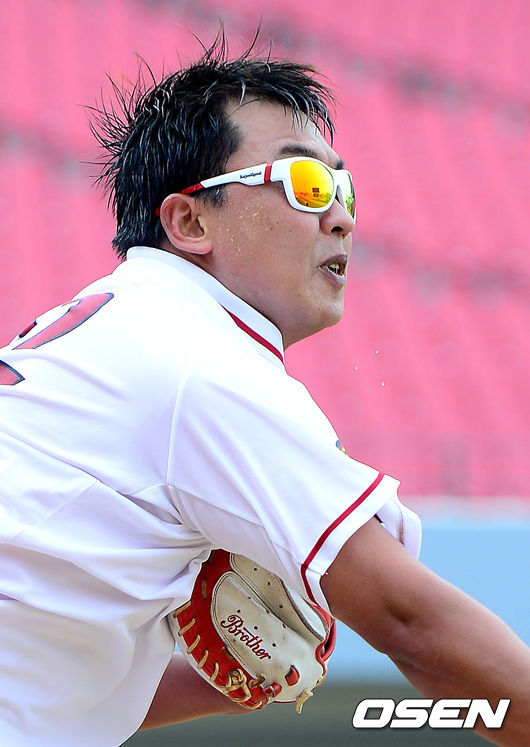 15일 오후 광주-기아 챔피언스 필드에서 열리는 '2014 한국야쿠르트 세븐 프로야구' KIA 타이거즈와 한화 이글스의 경기에 앞서 KIA 김상훈이 훈련을 하고 있다.