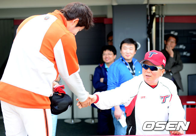 15일 오후 광주-기아 챔피언스 필드에서 열리는 '2014 한국야쿠르트 세븐 프로야구' KIA 타이거즈와 한화 이글스의 경기에 앞서 KIA 선동열 감독과 한화 이용규가 인사를 나누고 있다.