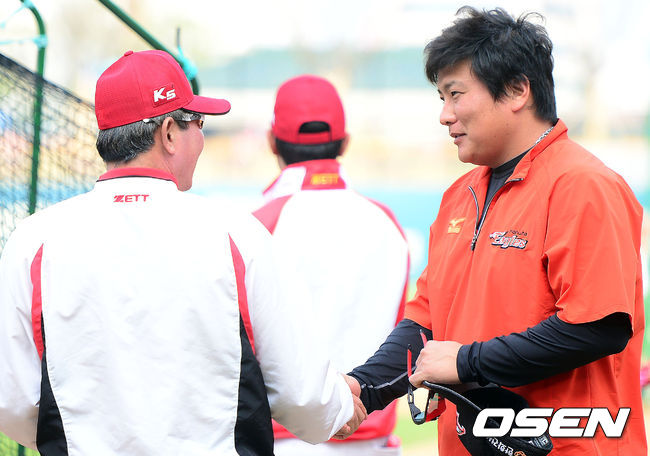 15일 오후 광주-기아 챔피언스 필드에서 열리는 '2014 한국야쿠르트 세븐 프로야구' KIA 타이거즈와 한화 이글스의 경기에 앞서 한화 김태균이 KIA 한대화 코치와 인사를 나누고 있다.