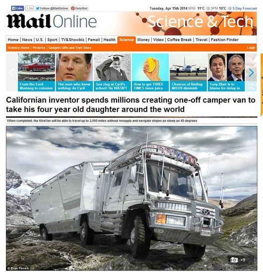 키라벤(kiraVan)이라고 이름 붙여진 이 캠핑카는 장기간 여행을 위해 캠핑카 내부에 사무실과 주방, 침실 등을 갖췄다. 또 캠핑카 지붕에는 텐트가 설치돼 있다.