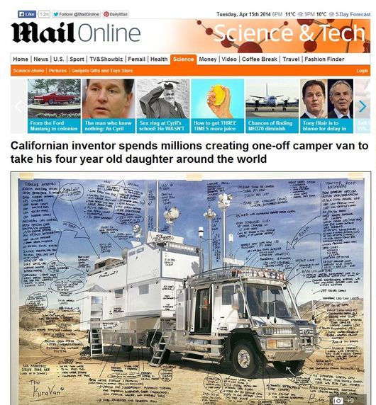 키라벤(kiraVan)이라고 이름 붙여진 이 캠핑카는 장기간 여행을 위해 캠핑카 내부에 사무실과 주방, 침실 등을 갖췄다. 또 캠핑카 지붕에는 텐트가 설치돼 있다.