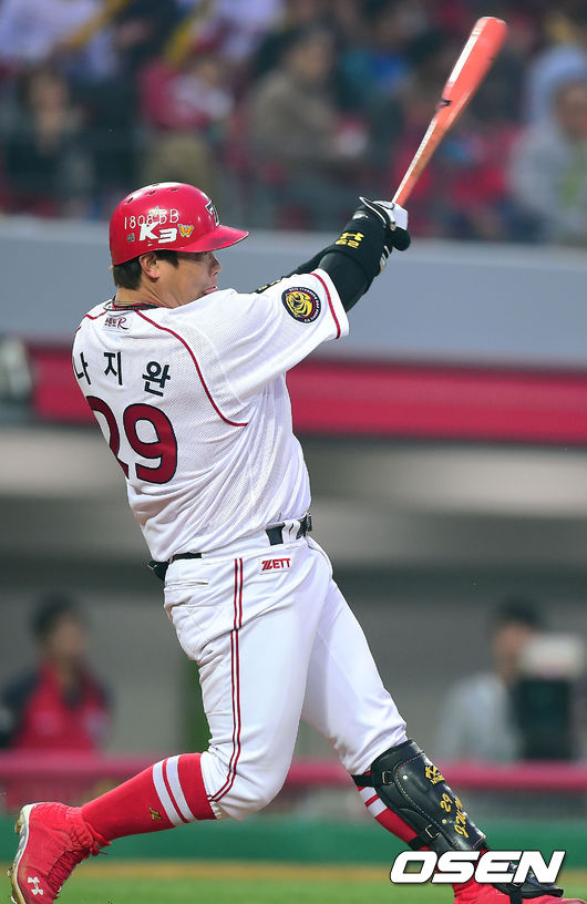 1회말 2사 2루 KIA 나지완이 1타점 적시타를 때리고 있다.
