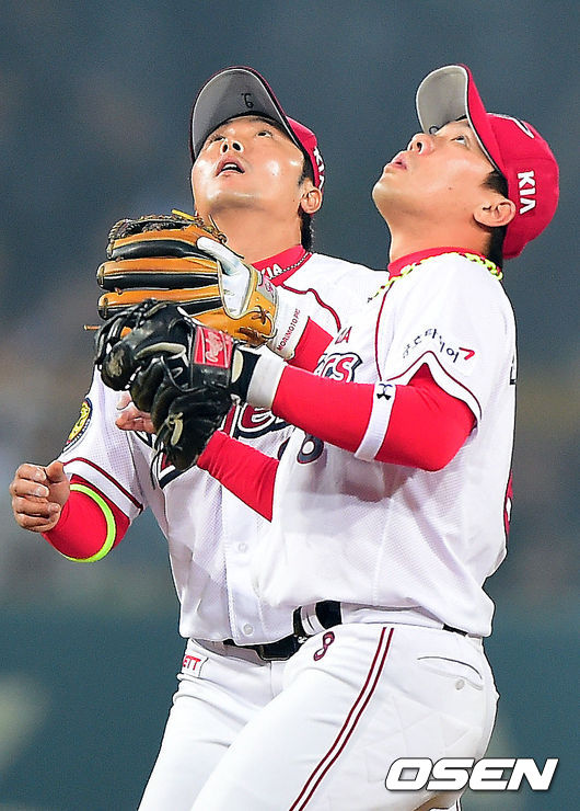 2회초 2사 1,2루 KIA 김민우와 안치홍이 한화 이용규의 뜬공을 처리하기위해 공을 바라보고 있다.
